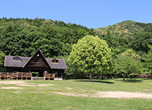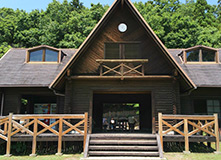 登山口の近くにあるログハウス。トイレと自動販売機で喉を潤せます。