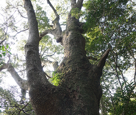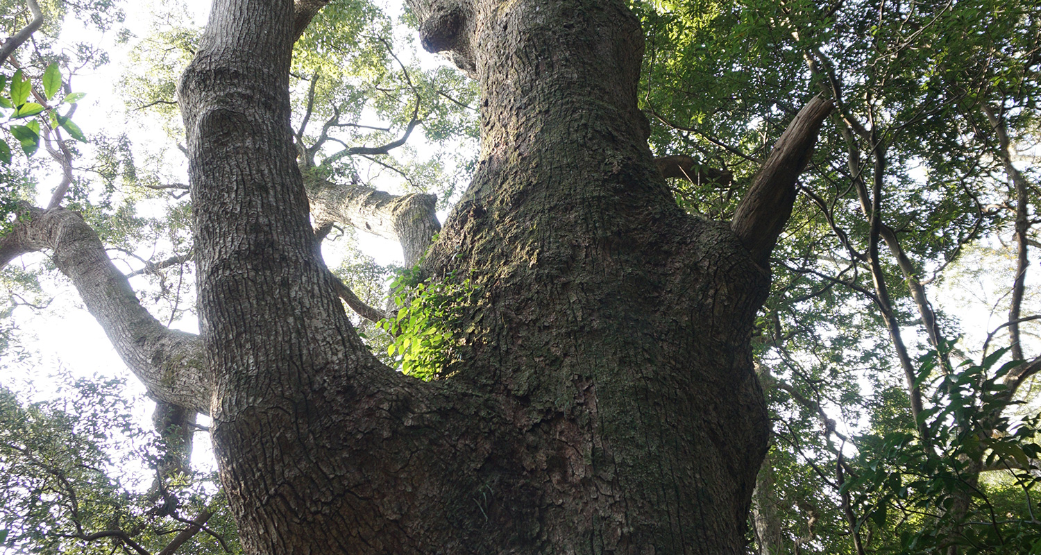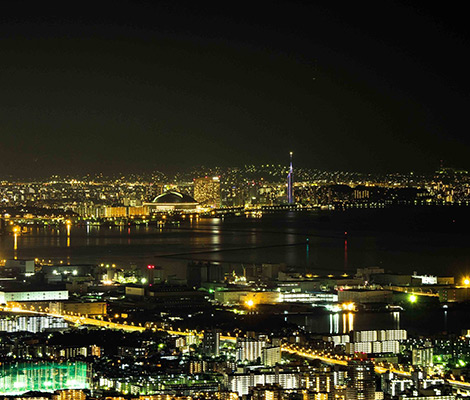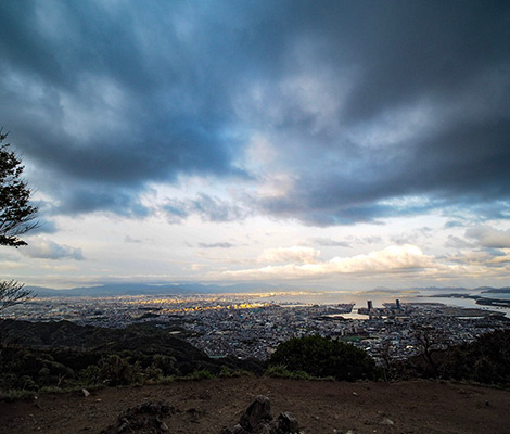 山頂手前の屏風岩に伸びる分岐点を5分ほど進むと、どっしりと構える樹齢300年の大クスが見られます。 山頂は博多湾方面にひらけており、香椎浜から糸島まで一望できます。日中はもちろんですが、市内の夜景も美しく、初心者のナイトハイクにもおススメです。 山頂直下の急坂を下り、緩やかに下る尾根道を進むと三日月山に登頂します。広々とした草原から360度の展望がみられます。