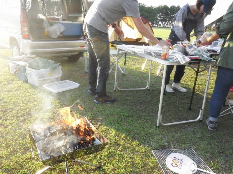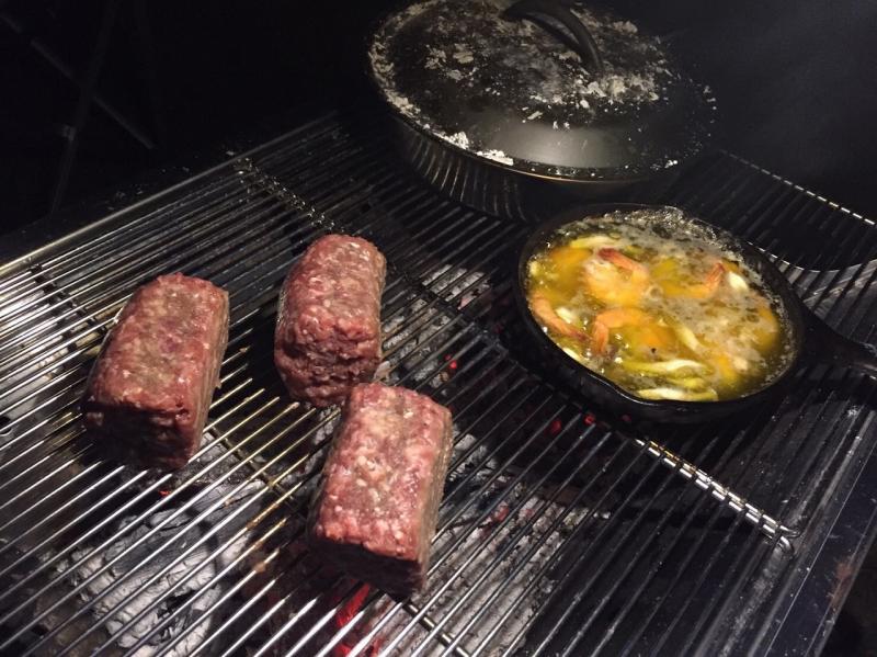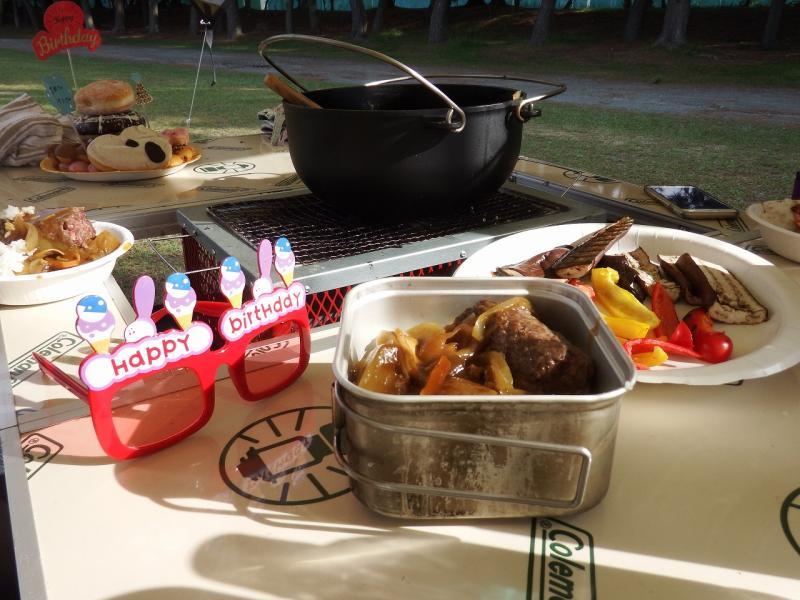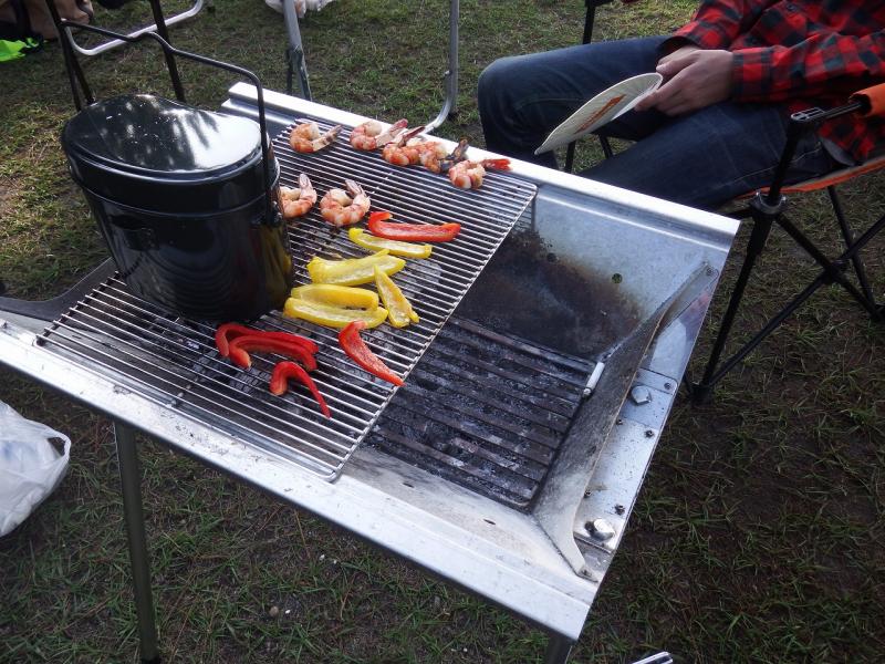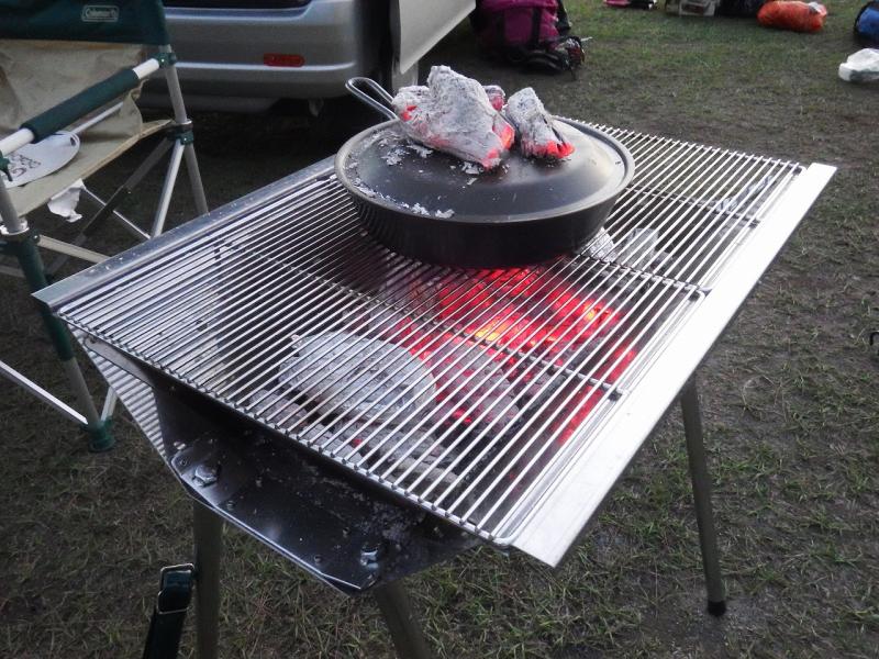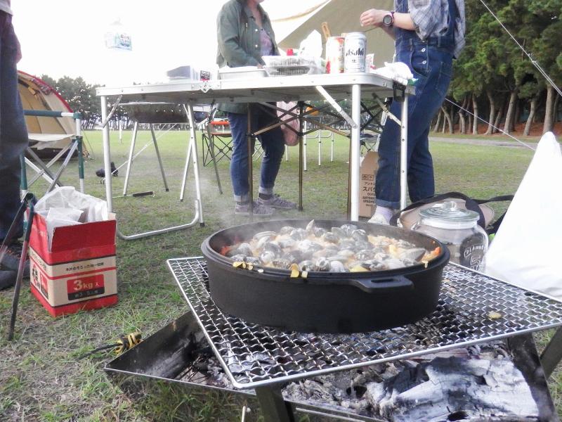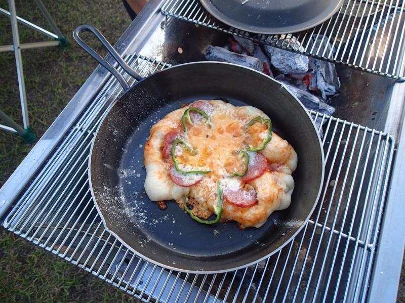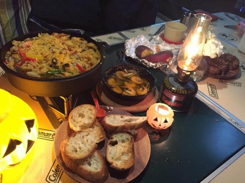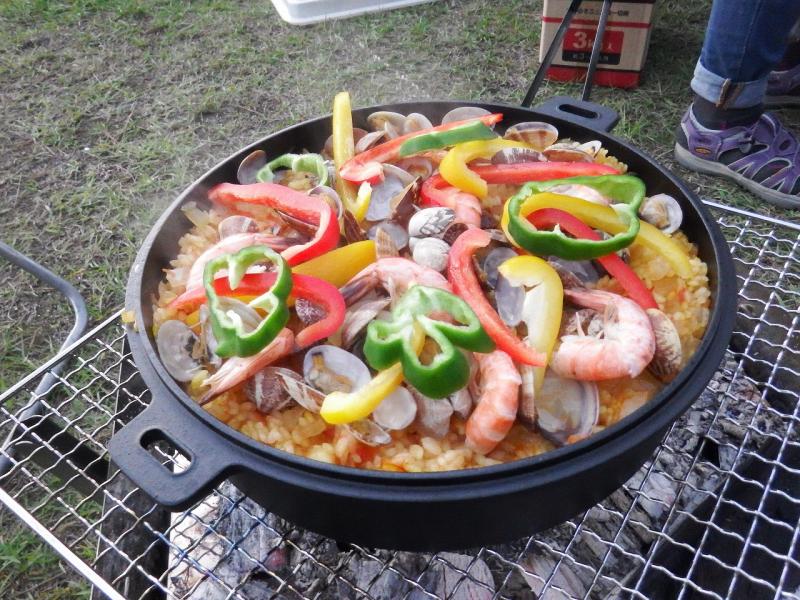 設営のあとはダッチオーブンでパエリアをやったり、スキレットでピザを焼いたり、コンロで焼き肉したりと食に重点を置く内容。これこそ大人キャンプ部です。