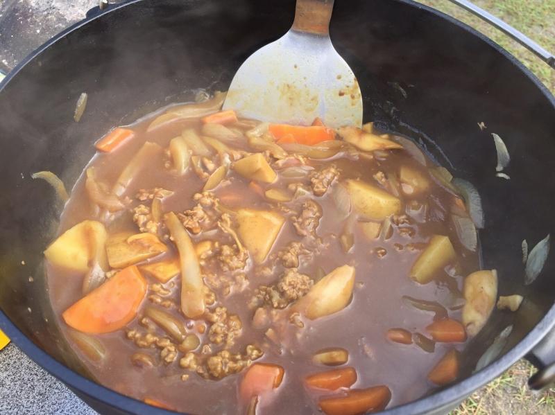 翌朝はカレーと焼野菜。ごはんは飯盒で炊きます。