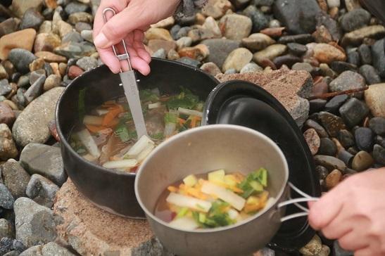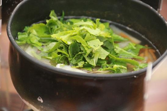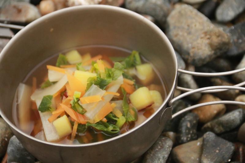 さて、次のスープは、天然出汁、自然塩、無農薬無肥料大豆の醤油。サツマイモ、ニンジン、大根、大根葉、具沢山のスープの完成です。満腹に近いので、うどん投入は辞めてスープだけで頂きました。冷えていたので、五臓六腑染み渡る旨さでした。