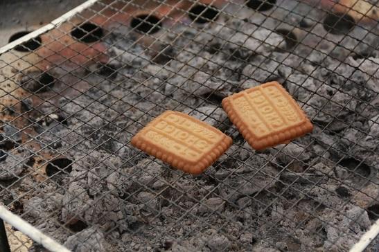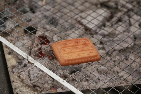やっと珈琲と入れ、市販の菓子チョイスを残り火で焼きながらゆっくりしようとしたところ、チョイス3枚で雨がひどく撤退することに致しました。チョイスを焼くと、焼きたての高級クッキーに早変わりです。お勧めです。