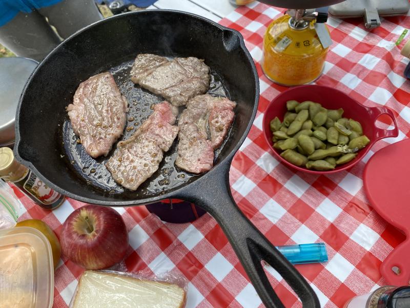まずは、お肉を焼いて~、おにぎりと枝豆と。