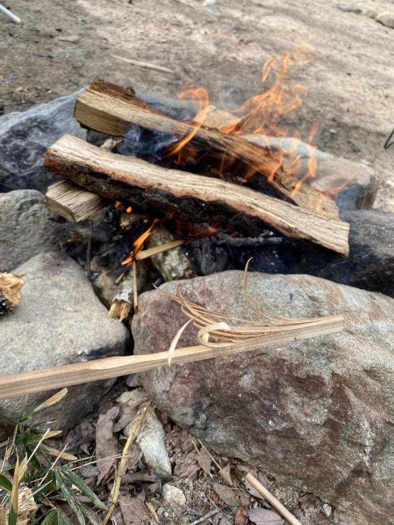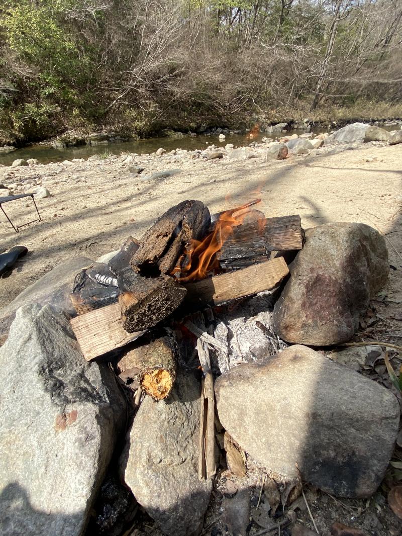 この日の焚き火は大きな薪をガンガン焚いてきました。