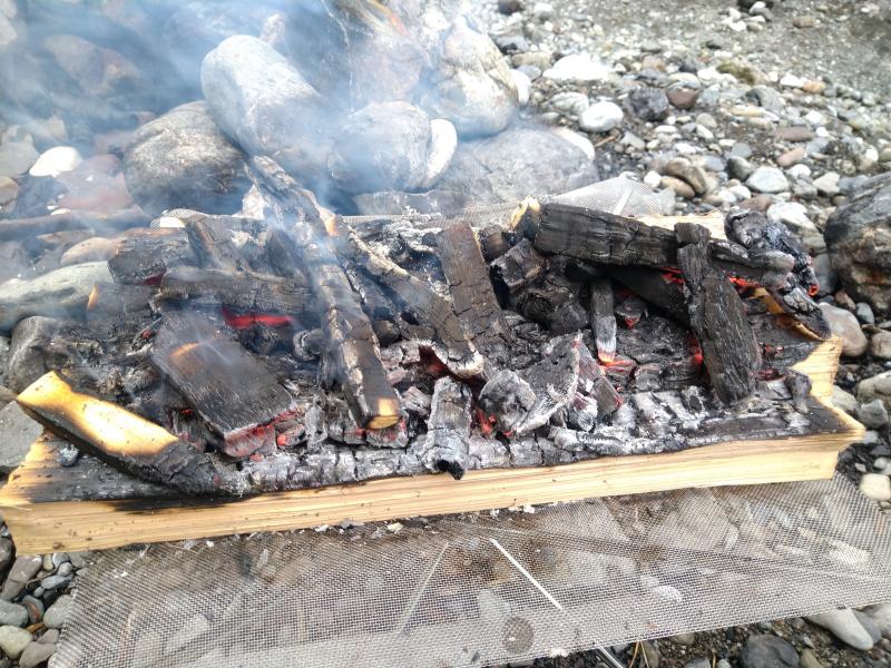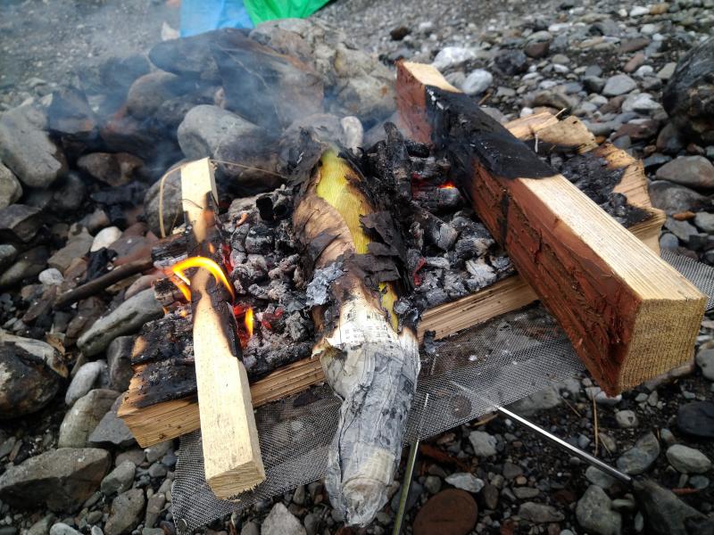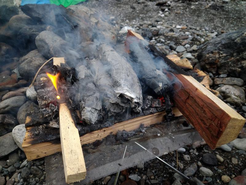 太めの薪を台座にして その上で火を焚きます。(そうしないと全部灰になってします。)