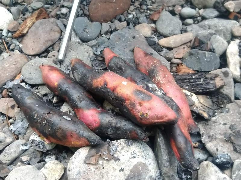 火を落ち着かせたら新聞紙に巻いて濡らしたトウモロコシとサツマイモを投入。