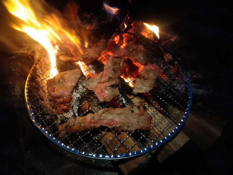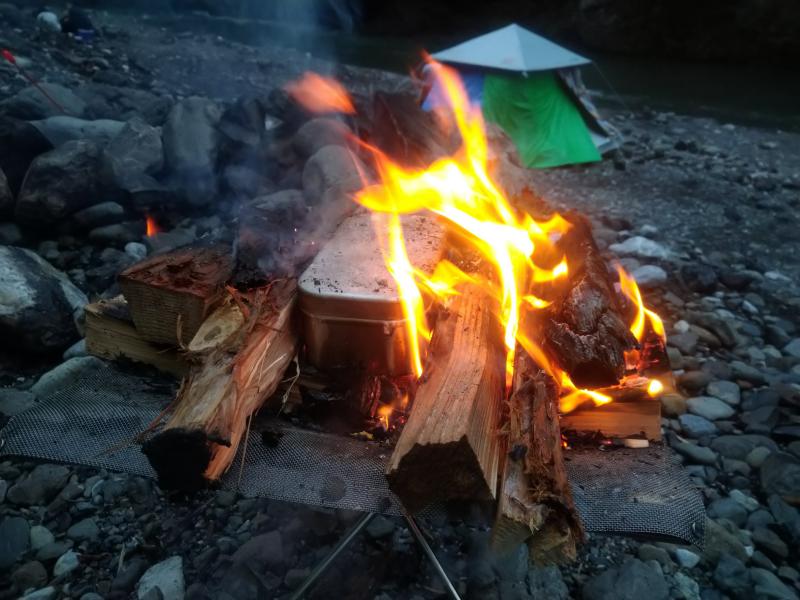 売店で薪を一カゴ買ってきて焚火をスタート。
