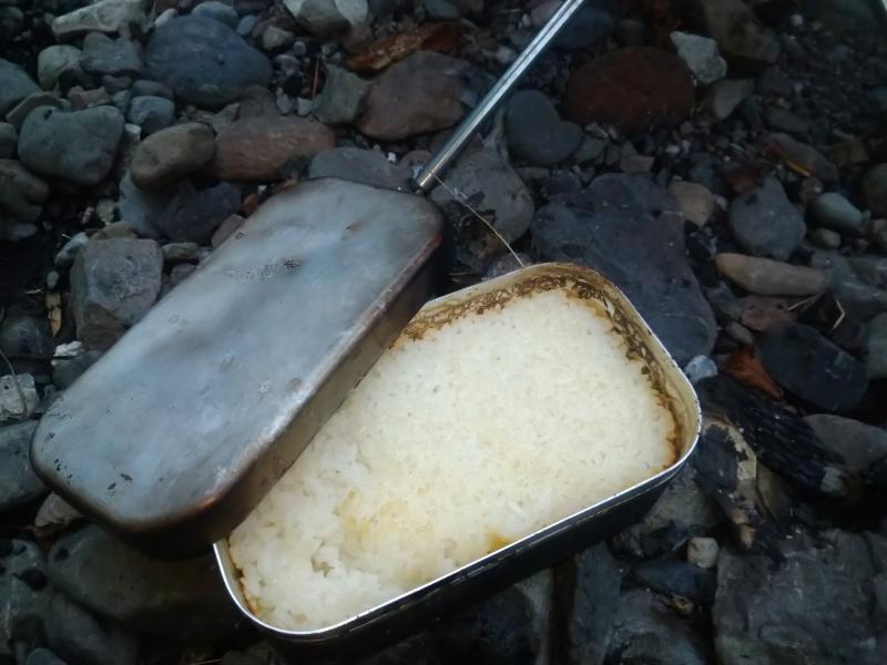 続いてメスティンでお米を炊くのですが 水と火力を間違えて焦げた…