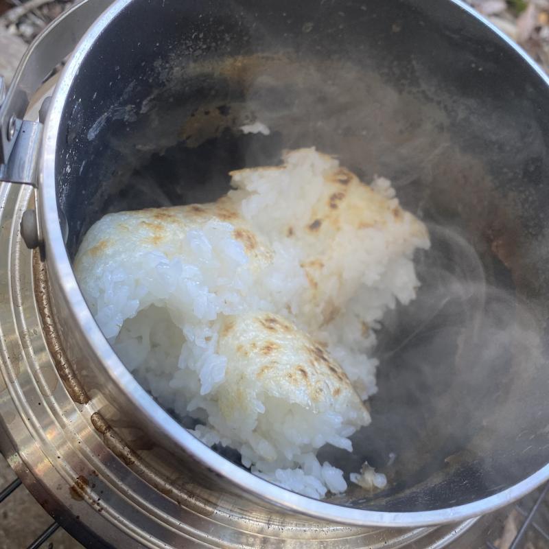 焚き火の場合、火加減が少しむずかしく、羽釜を持ち上げて見たら