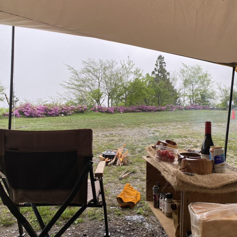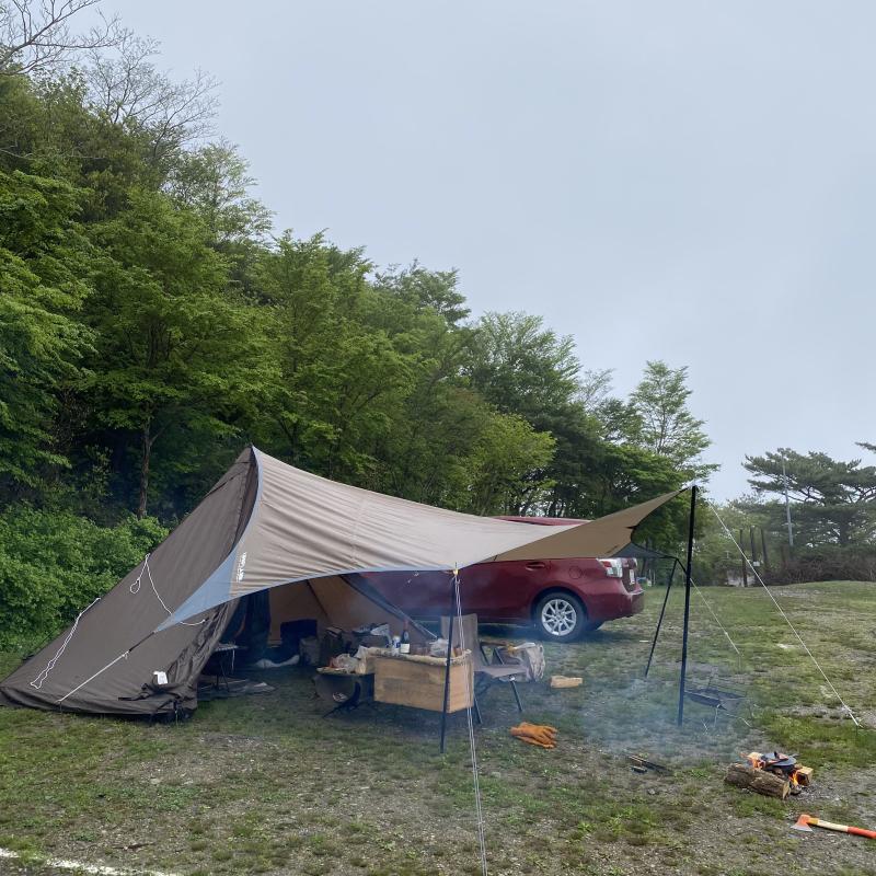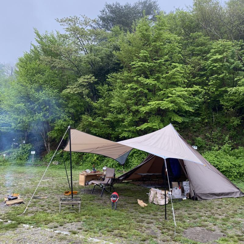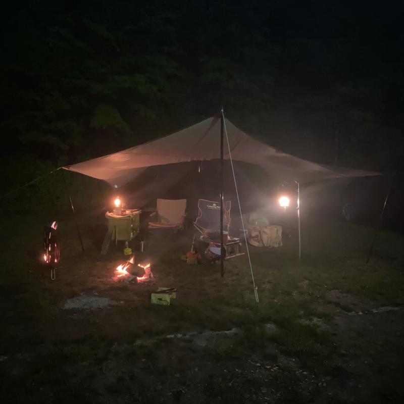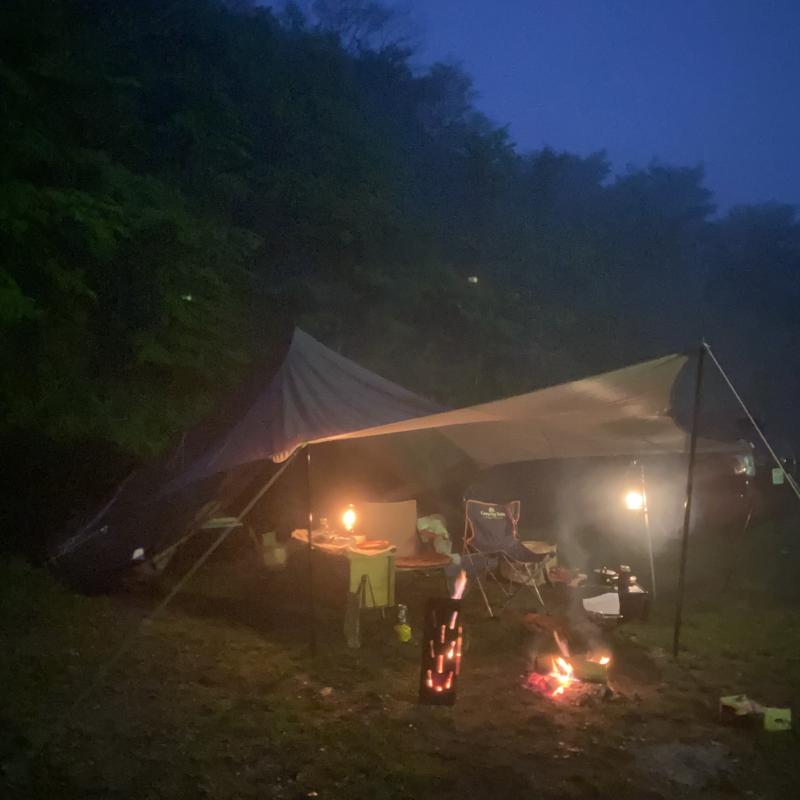 霧雨でしたので焚き火(直火OK)がタープから離れてできたのも良かったです。