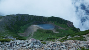 登山で出会う湖は神秘的なものが多いですが、火山の噴火口にできた写真の湖はどこにあるでしょうか。(【三択】1.霧島・韓国岳 2.鷲羽岳 3.立山)