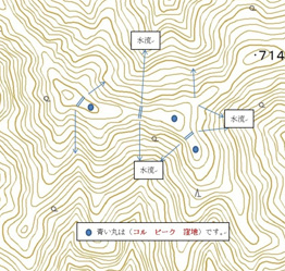 等高線がマッチの頭のように輪となっているところがピークですが、地形図に現わすことができないピークがあるのをご存知でしょうか。等高線は標高差10m毎に描かれています。図の地形図にある青い線は稜線からの水流です。三つの青い●印はどんな場所だと推測できるでしょうか。(【三択】1.コル 2.ピーク 3.窪地)