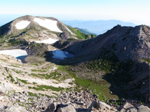 槍穂高連峰を縦走すると様々な種類の火山性岩石を見ることができます。176万年前と175万年前に起きた大噴火によってできたカルデラに厚く堆積した火砕流堆積物があります。その痕跡は槍沢を登る途中にある播隆上人の岩小屋や槍ヶ岳の穂先への向かう途中の角礫岩、穂高岳へ向かう南岳から氷河公園へ下る途中に出てくる角がある礫を含んだ岩石からわかります。その岩を(【三択】1.溶結凝灰岩 2.花崗岩 3.玄武岩)といいます。