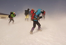 山で強風に出会うのは危険です。傘をまともに差すことができず、歩きにくくなるのは10m/s を.越え、風に向って歩くのが困難になり転倒するようだと15m/s を越えています。風はいつも同じように吹くのでは無く強弱があります。これを風が(【三択】1.乱れる 2.息する 3.遊んでいる) といいます。強風下、行動が困難になった場合でも、風が弱まったタイミングで、樹林帯に向うなどの退避することがあります。