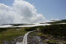 高層湿原とは高山にある湿原という意味ではありません。地下水位より低い湿原面を持つ場合は低層湿原でミズバショウ、エゾノリュウキンカなどの水生植物が生育します。 地下水位より高ければ高層湿原といい、雨水や霧などによって潤されているため(【三択】1.栄養分 2.ミネラル分 3.太陽光)が極端に少なく酸性度も高いので、ミズゴケ、ウメバチソウ、ワタスゲ、モウセンゴケなど限られた植物のみが生育できます。両者の中間であれば中間湿原といいます。