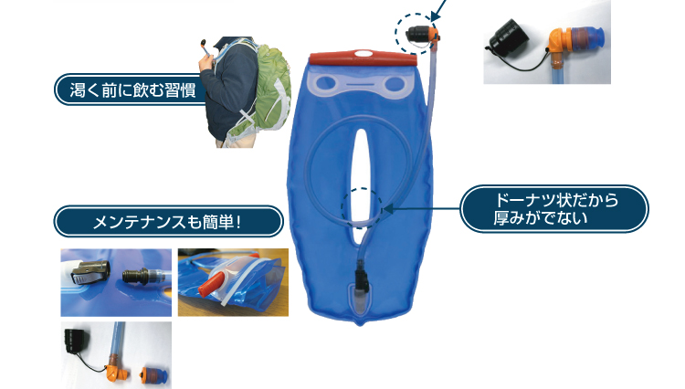 タンクに水を入れた際、厚みが出ないようにタンクの中央に穴を設けています。タンクを背負った時のゴロゴロする感触が軽減されます。