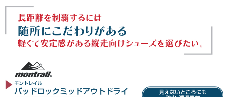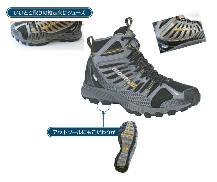 縦走コースでは、様々な条件の道に遭遇します。どんなところでも対応できるグリップ力と、滑りにくい工夫が施されたアウトソール。