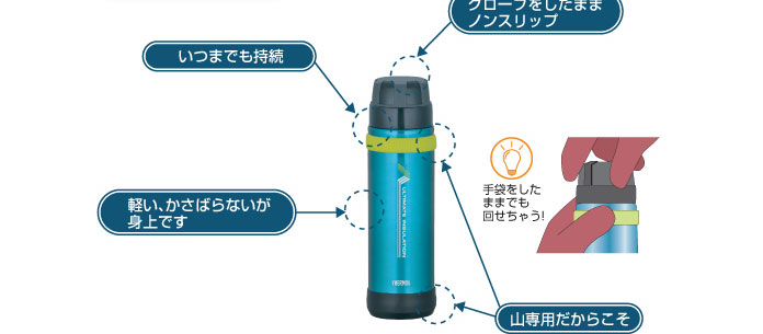 冬山での保温力を優先した36mmの口径を採用。保温力が長時間キープするので、冷えきったカラダをいつでも温めてくれます。