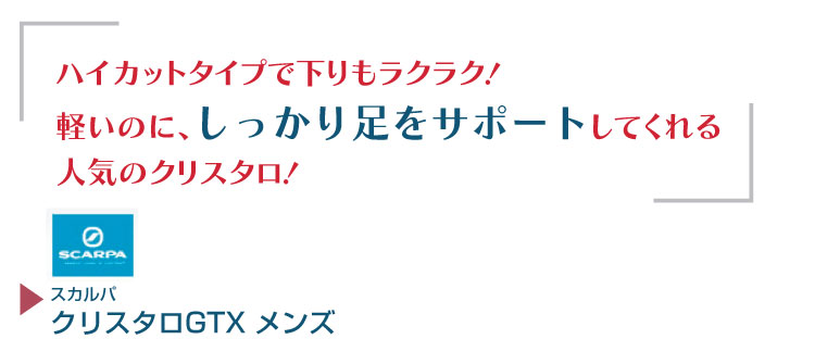 幅広で厚みがあるので、軽いのにしっかりと足を守ってくれます。冬季以外の森林限界を越えた岩稜帯におススメ!ゴアテックス®使用のシューズです。