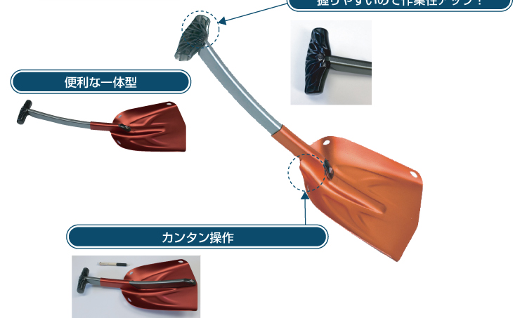 グリップはT型のコンパクトさとD型の握りやすさを兼ね備えたT&Dグリップを採用。ゆるやかにベントしたシャフトはブレードにぴったりと収まり、小型パックにも収納可能です。