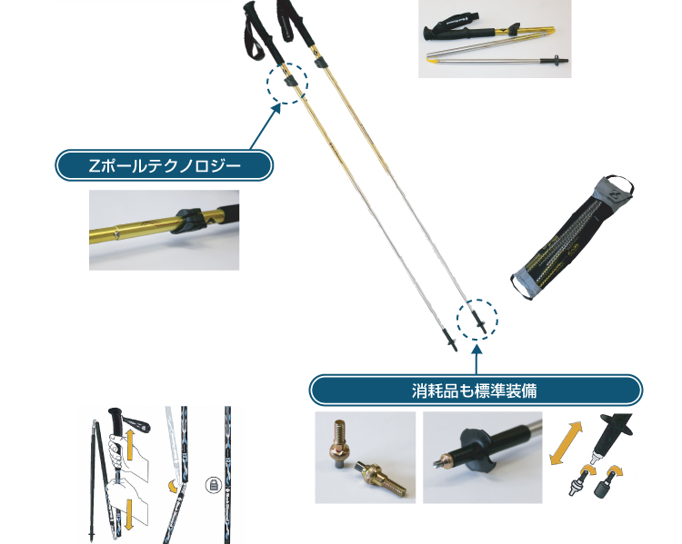 Z型に折りたたむことによってコンパクトさを追求。岩場など使わないときは、サッとたたんで収納袋に入れるとこんなにコンパクトに!