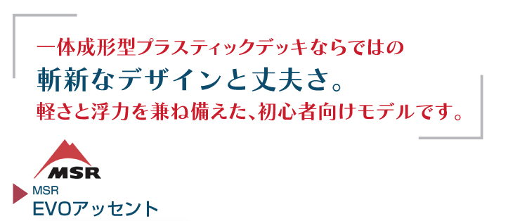 立体的なデッキ先端部分と細くシェイプしたテイル。初心者でも歩きやすい工夫が随所にあります。手袋をつけたままでも、簡単に装着できます。