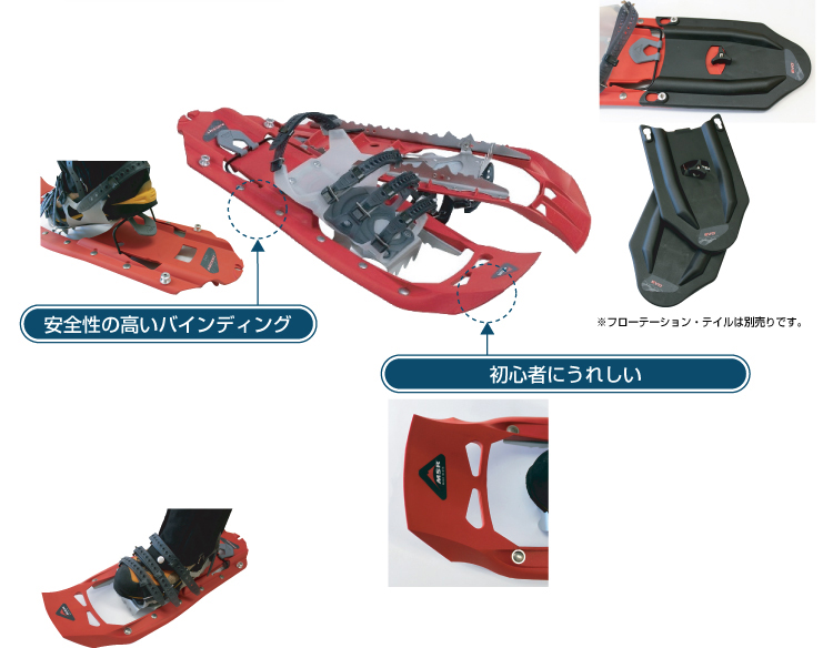 脱着可能なフローテーション・テイルが雪道で必要な浮力を生み出すので、1台のスノーシューで、どんな状況の雪にも対応します。