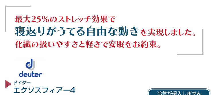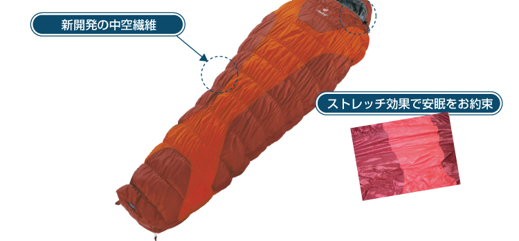 最大25%のストレッチ効果。シャーリング加工で寝返りだって打ててしまう嬉しいシュラフは、自由な動きができるので安眠をお約束!