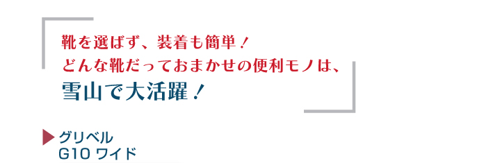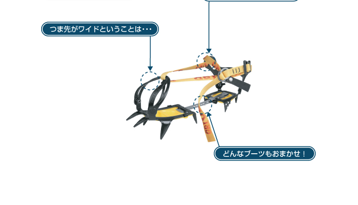靴を選ばず、装着も簡単なプラスチックハーネスを使用した10本爪アイゼンです。つま先部分が通常より広くできているので、ボリュームのある防寒ブーツ、スノーボードのソフトブーツなどでも装着が可能です。