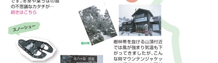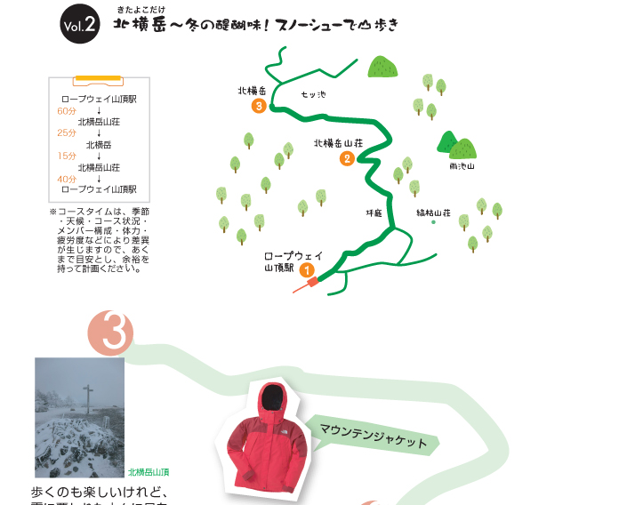 のんびり、ゆっくりと冬山ならではの景色を眺めながら、スノーシューハイクを楽しもうと計画。スノーシュー初体験の友人を誘って、ピラタス蓼科から北横岳への道程を野を越え丘を越え、雪に埋もれた大自然を満喫しました。