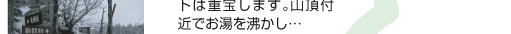 山頂から北横岳山荘まで、約1時間かけて樹林帯へ。雲の間から見える景色が、だんだんと広がってきます。ここまではロープが張られ、案内板もわかりやすいので、比較的安全ですが、途中に階段や岩などは積雪が少なく、スノーシューでは歩きにくい所もありました。