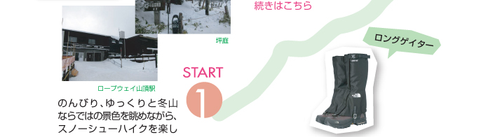 スキー場のロープウェイに乗って、標高2,237メートルの北八ヶ岳・坪庭へ。ここからスノーシューを装着して、ゆっくりと歩きはじめました。もちろん、雪山には欠かせないロングゲイターも忘れてはいけません。