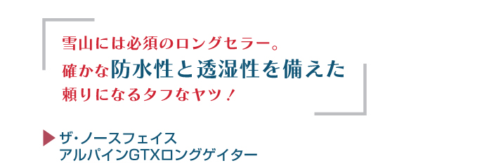 GORE-TEX®ファブリクスは、雪山で求められる確かな防水性と透湿性を備えています。