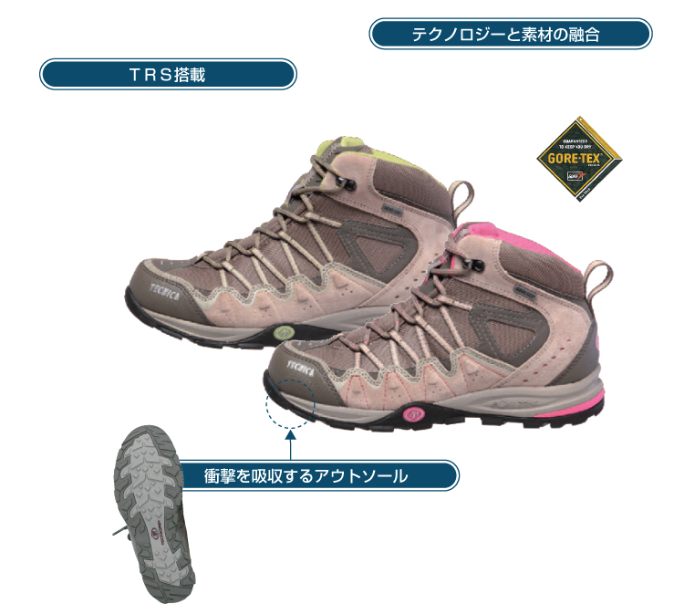 TRS(テクニカローリングシステム)とは、歩くとき前方への加重移行がスムーズに行え、エネルギーの伝達力とクッション性に優れたシステムのこと。スムーズな足運びがうれしい軽量ハイキングシューズです。