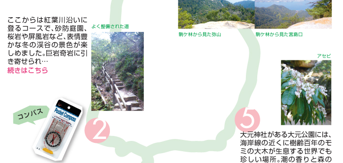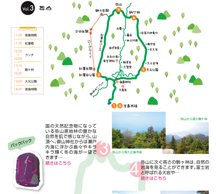 国の天然記念物になっている弥山原始林の豊かな自然を肌で感じながら、山頂へ。御山神社からは瀬戸内海に浮かぶ島々やキラキラ輝く冬の海が一望できます。おしゃべりも忘れて、しばらく時間が止まったかのような感覚に浸っていました。弥山展望台でランチタイムをとることに。今日背負ってきた相棒・バックパックは、私のお気に入り。カラーもかわいいしポケットがいっぱいついてて、とっても機能的。広島から背負ってきたけど、シティユーズにもぴったりなんです。なんて、お互いのリュック自慢をしながら、楽しいランチタイムを過ごしました。
