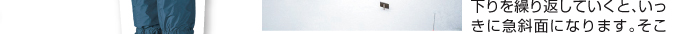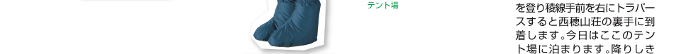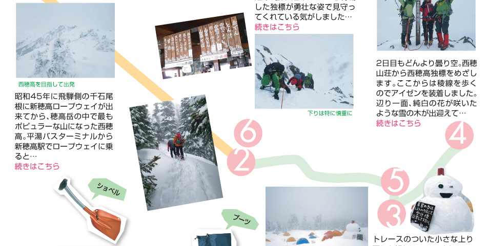 トレースのついた小さな上り下りを繰り返していくと、いっきに急斜面になります。そこを登り稜線手前を右にトラバースすると西穂山荘の裏手に到着します。今日はここのテント場に泊まります。降りしきる雪に備え、早目にテントを設営することに。雪を踏み固めてから、スノーソーとショベルを使って雪を切り出し風よけのブロックを作りました。実は雪山登山は初めてなので、経験者の先輩に基礎を教わりながらのテント設営です。踏み固めた上から雪が積もるので、悪戦苦闘しながら何とか壁が完成。やっとテントを張ることができました。