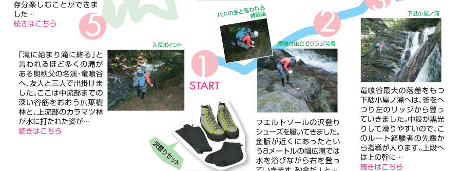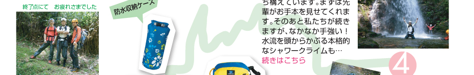 水流を登り、末広がりのナメ床が続く滝上へ。そのあとは左側から滝の中央を水流を浴びながら登っていきました。今日はズブ濡れ覚悟だったので、お洒落なグラフィック柄の防水収納ケースを持参、貴重品も無事濡れずに済みました。