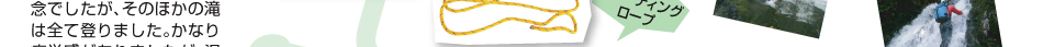 竜喰谷最大の落差をもつ下駄小屋ノ滝へは、釜をへつり左のリッジから登っていきました。中段が黒光りして滑りやすいので、このルート経験者の先輩から指導が入ります。上段へは上の幹にスリングをかけ、フローティングロープを使って先輩の後を続きます。華麗なテクニックを見せられると、沢登りの奥深さを改めて痛感しました。