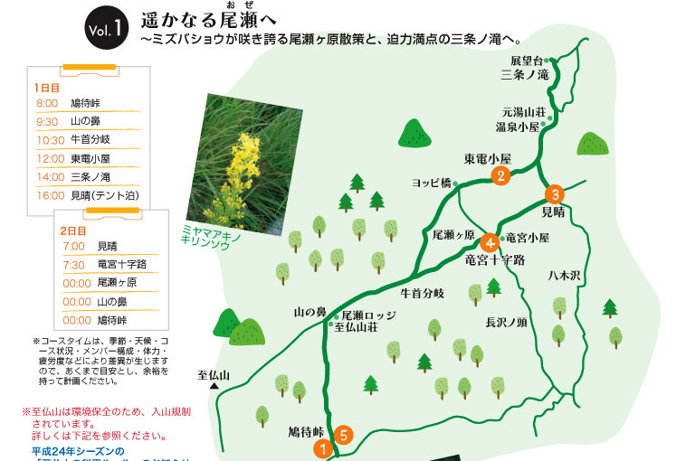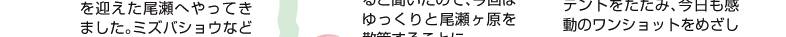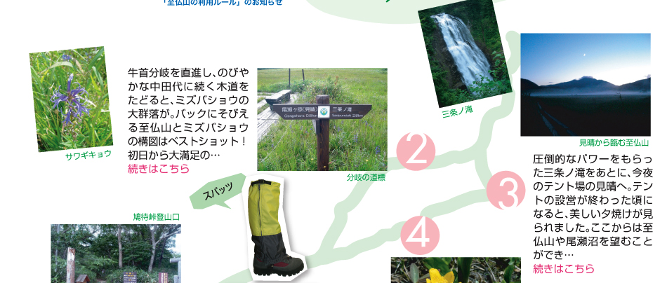 吹き抜ける風とどこまでも続く大地、そして広がる空、この景色が尾瀬を感じる瞬間です。何回訪れても、この空気が出迎えてくれます。雪の下でまだかまだかと待ちかまえていた生命の息吹たちが、雪がとけると同時に咲きはじめる風景も、楽しみのひとつです。山の鼻から牛首分岐の間にも、ミヤマアキノキリンソウやサワギキョウなど、可憐な花たちが姿を見せてくれました。