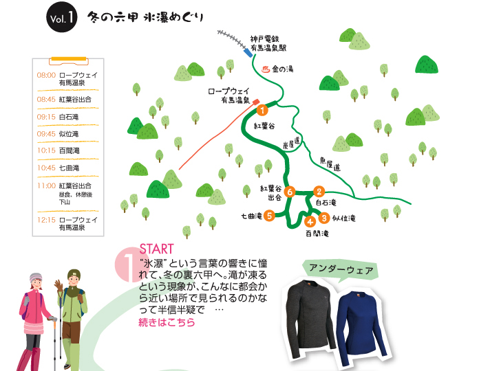 "氷瀑"という言葉の響きに憧れて、冬の裏六甲へ。滝が凍るという現象が、こんなに都会から近い場所で見られるのかなって半信半疑で、六甲有馬ロープウェイの有馬温泉駅をスタート。 さすがに1月の六甲山の気温は、冷え込みます。今回は寒さ対策を万全にと、山ガールファッションの下には、通気性や保湿性に優れたメリノウールのアンダーウェアを着用。重ね着してもかさばらず快適! 実はカレと色違いで揃えちゃいました。