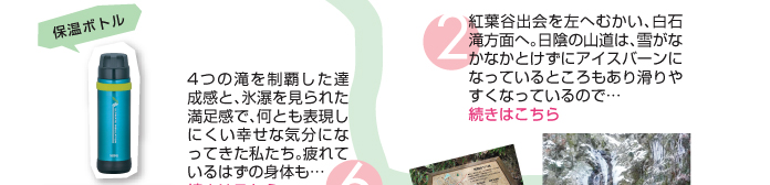 4つの滝を制覇した達成感と、氷瀑を見られた満足感で、何とも表現しにくい幸せな気分になってきた私たち。疲れているはずの身体も、思うほどの疲労感ありません。紅葉谷まで上り、お楽しみのランチ&カフェタイム。 私が作ったサンドイッチと冷え切った体を癒す保温ボトルに入れてきた暖かいコーヒー。ほっこりしながら、今日出会うことができた雄大な自然が生み出した姿を、ふたりで思い浮かべていました。