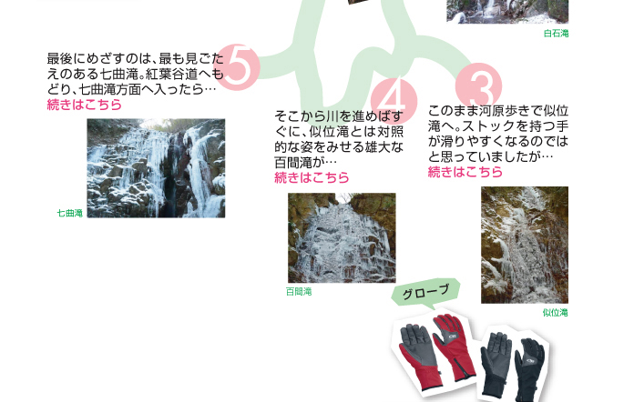 このまま河原歩きで似位滝へ。ストックを持つ手が滑りやすくなるのでは思っていましたが、好日山荘ですすめられたWINSTOPPER(R)のグローブは、手のひら部分に滑り止めがついていたので助かりました。熱を逃がさないというフレコミ通り、手もかじかまずに、どんどん、どんどん滝をめざして進んでいきました。 夏場は繊細に流れ落ちる滝が、完全に凍っていて見事な氷瀑が現れました。