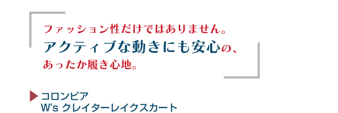 裾部分は運動性を確保しながらも、まくり上がりを防止するアジャストコード仕様です。細キルトで履き心地が軽く、パンツやレギンスの上に重ねて防寒になる、運動性と保温性を兼ね備えたスカートです。