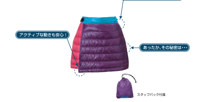 中綿は高品質な700FPのグースダウンを使用しているので、保温性に優れています。コンパクトに収納できるスタッフバッグ付き。冬のアウトドアシーンにピッタリなスカートです。