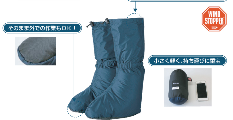 防風性と透湿性を兼ね備えたゴアテックス®ウインドストッパーと70gのダウンで暖かく、雪濡れにも強いテントシューズ。