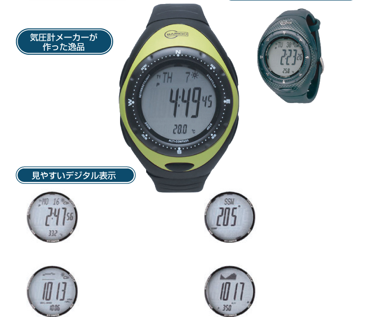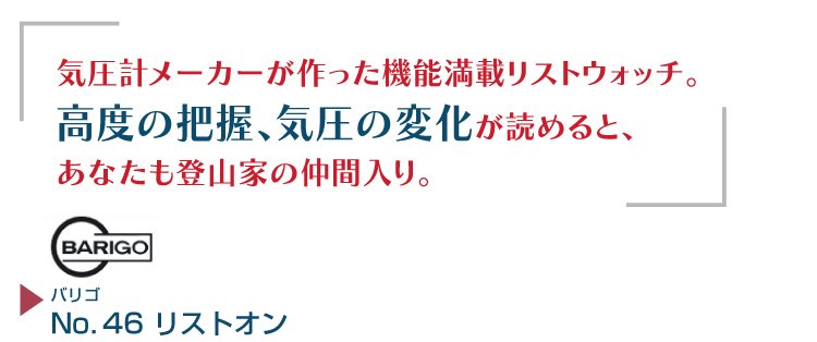 1926年、ドイツで創業した船舶用の高級気圧計メーカーのバリゴが登山用に開発した、アクティブシーレベル機能を搭載した知的な一台です。高度計と気圧計を計測して高度を算出するのがバリゴの高度計なのです。