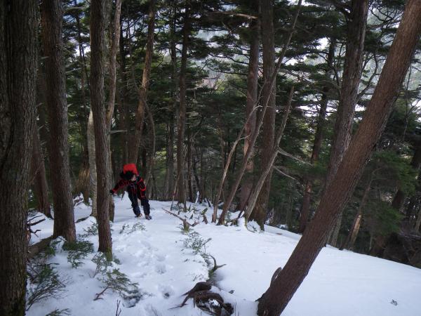 - 標識⑦から樹林帯の中を登るが、かなりの急登です。45度くらいの傾斜に感じました。