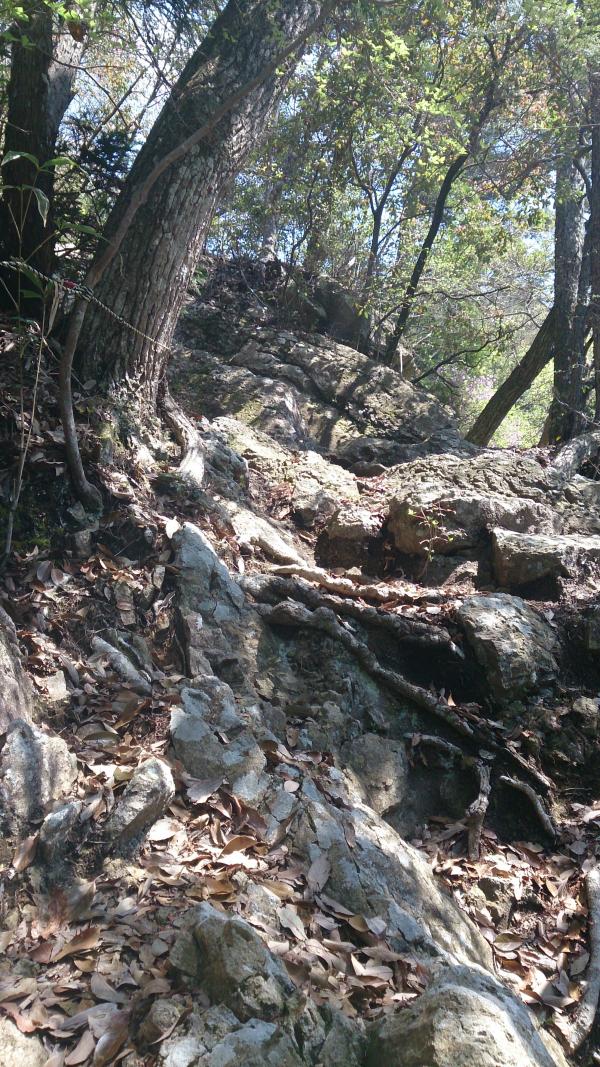 神社以降は急坂が続き、岩場歩きが連続します。