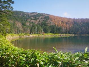 駐車場から双子山まで登った後は笹原をグングン下り双子池ヒュッテのある双子池まで下ります。雄池は飲料水として水質検査にも合格した水を汲む事ができます。もう一つの雌池のほとりはキャンプ指定地になっていますが2か所あるトイレはどちらも難ありでした(残念)