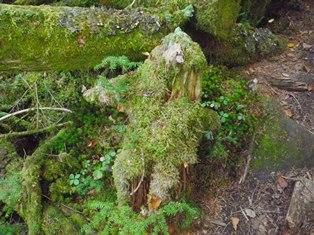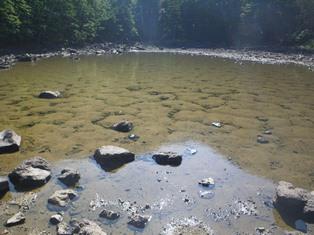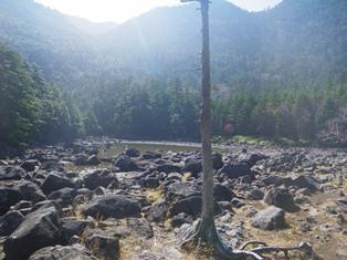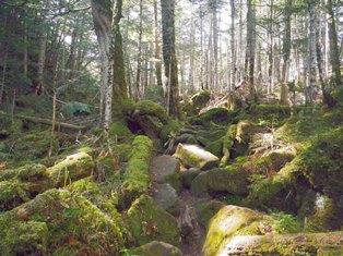 双子池から亀甲池へは苔むした岩や大木の間を縫うように登っていきその美しさについ足が止まりがちになりました。亀甲池は水量が少なかったため池の名前の由来である亀甲模様を見ることができラッキー。この日の時点では満水時から50~60cmほど少なかったようです 季節的なところもあるのでしょうか。亀甲池から駐車場にかけては左には昨日登った大きな蓼科山や背後にはゴツゴツと粗々しい大岳、北横岳などをみながらゆっくりと綺麗な笹の尾根を上がって行きます。